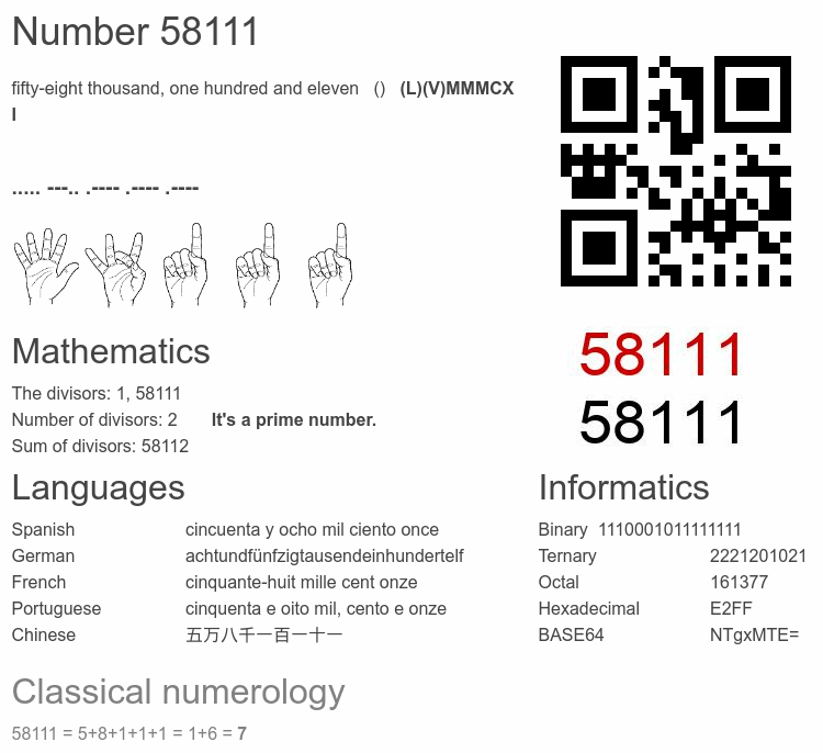| Spanish: | 🔊 (número 58.111) | cincuenta y ocho mil ciento once |