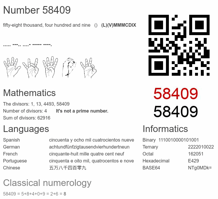 | Chinese: | 🔊 (数 58 409) | 五万八千四百零九 |