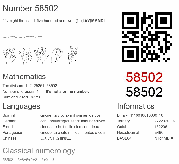 | Spanish: | 🔊 (número 58.502) | cincuenta y ocho mil quinientos dos |