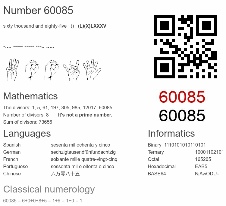 | Spanish: | 🔊 (número 60.085) | sesenta mil ochenta y cinco |