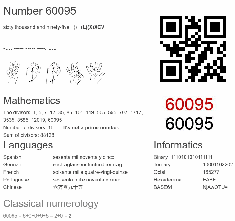 | Spanish: | 🔊 (número 60.095) | sesenta mil noventa y cinco |