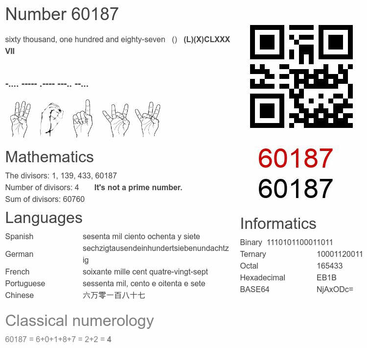 | Spanish: | 🔊 (número 60.187) | sesenta mil ciento ochenta y siete |
