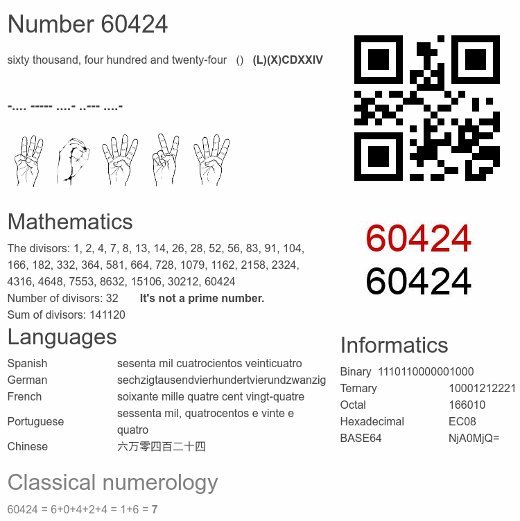 | Spanish: | 🔊 (número 60.424) | sesenta mil cuatrocientos veinticuatro |