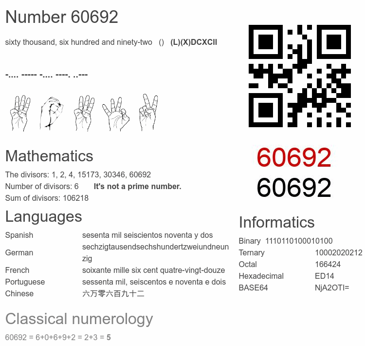 | Portuguese: | 🔊 (número 60 692) | sessenta mil, seiscentos e noventa e dois |