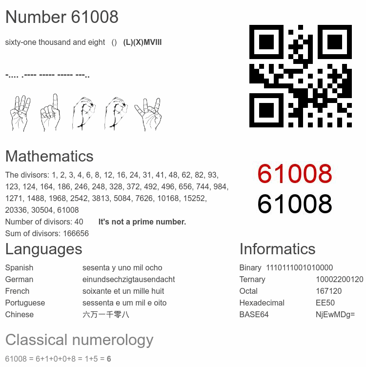 The even number 61,008 is spelled 🔊, and written in words: sixty-one thousand and eight. The ordinal number 61008th is said 🔊 and written as: sixty-one thousand and eighth. The meaning of the number 61008 in Maths: Is it Prime? Factorization and prime factors tree. The square root and cube root of 61008. What is 61008 in computer science, numerology, codes and images, writing and naming in other languages. Other interesting facts related to 61008.