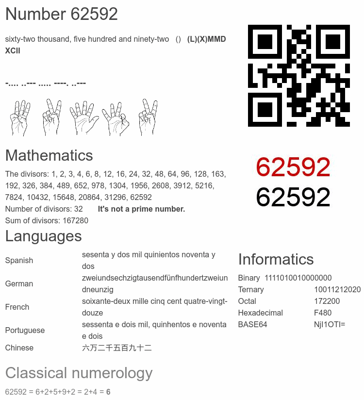 | Spanish: | 🔊 (número 62.592) | sesenta y dos mil quinientos noventa y dos |