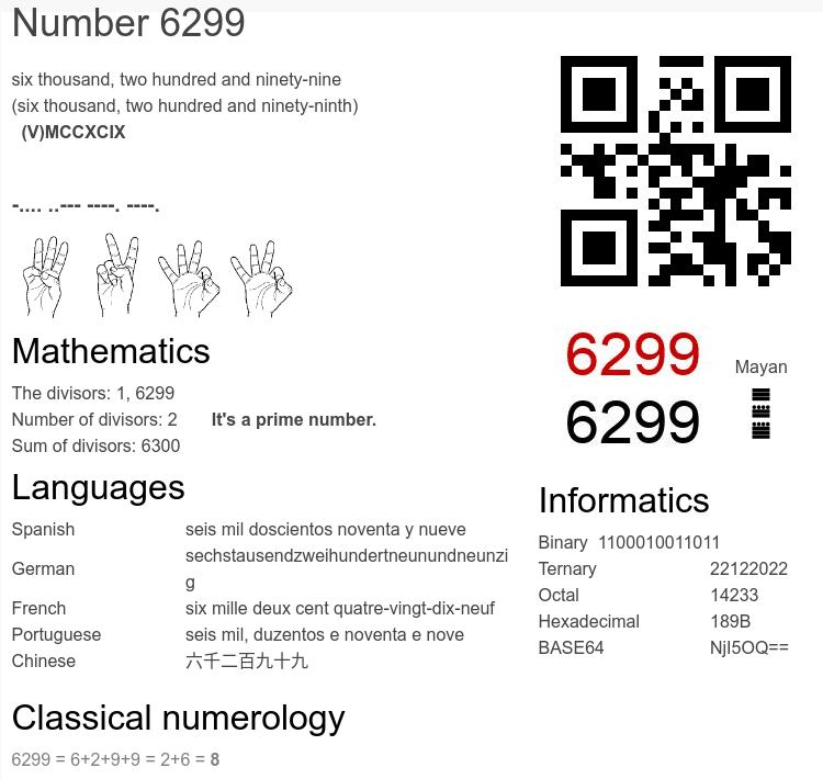 | Spanish: | 🔊 (número 6.299) | seis mil doscientos noventa y nueve |