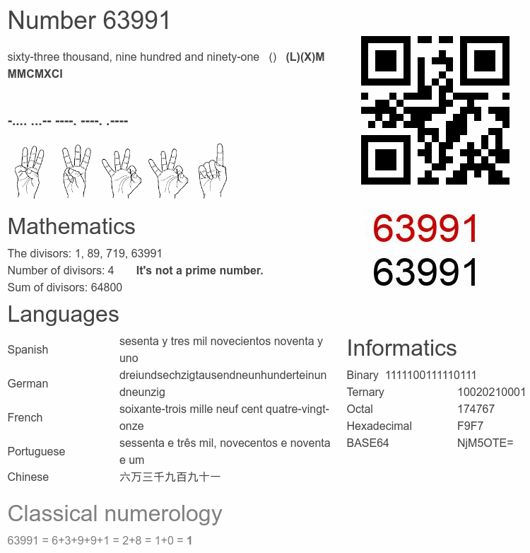 | Arabian: | 🔊 (عدد 63,991) | ثلاثة و ستون ألفاً و تسعمائةواحد و تسعون |