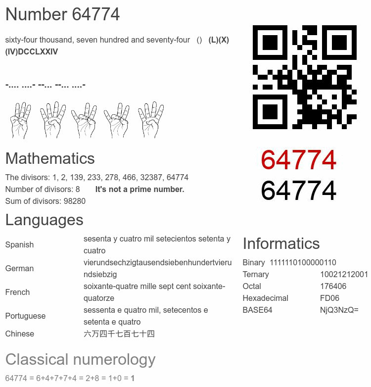 | Spanish: | 🔊 (número 64.774) | sesenta y cuatro mil setecientos setenta y cuatro |