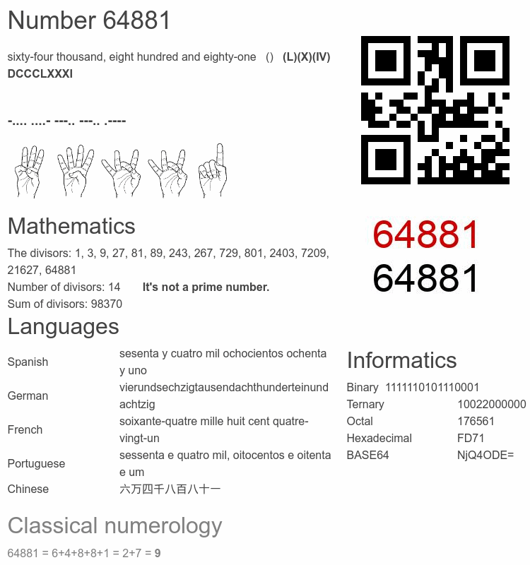 | Japanese: | 🔊 (数 64,881) | 六万四千八百八十一 |