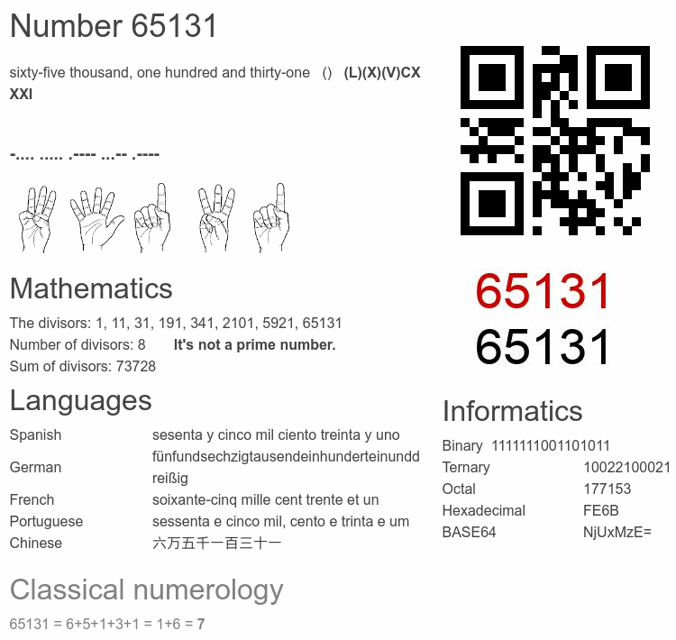 | Spanish: | 🔊 (número 65.131) | sesenta y cinco mil ciento treinta y uno |