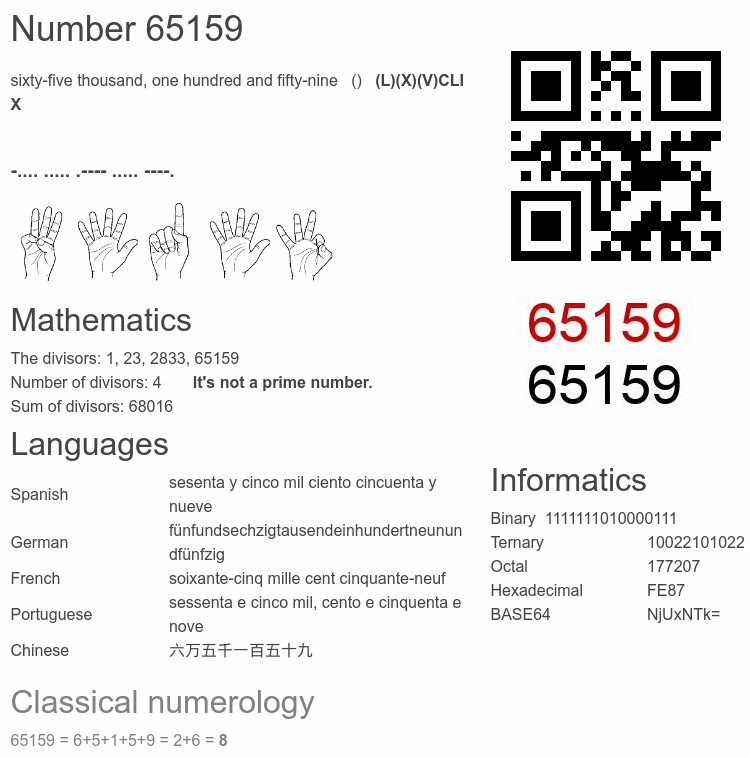 The odd number 65,159 is spelled 🔊, and written in words: sixty-five thousand, one hundred and fifty-nine. The ordinal number 65159th is said 🔊 and written as: sixty-five thousand, one hundred and fifty-ninth. The meaning of the number 65159 in Maths: Is it Prime? Factorization and prime factors tree. The square root and cube root of 65159. What is 65159 in computer science, numerology, codes and images, writing and naming in other languages. Other interesting facts related to 65159.