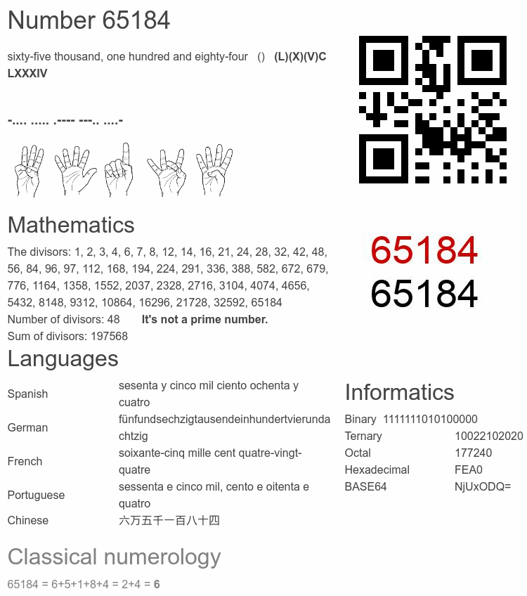 | Portuguese: | 🔊 (número 65 184) | sessenta e cinco mil, cento e oitenta e quatro |