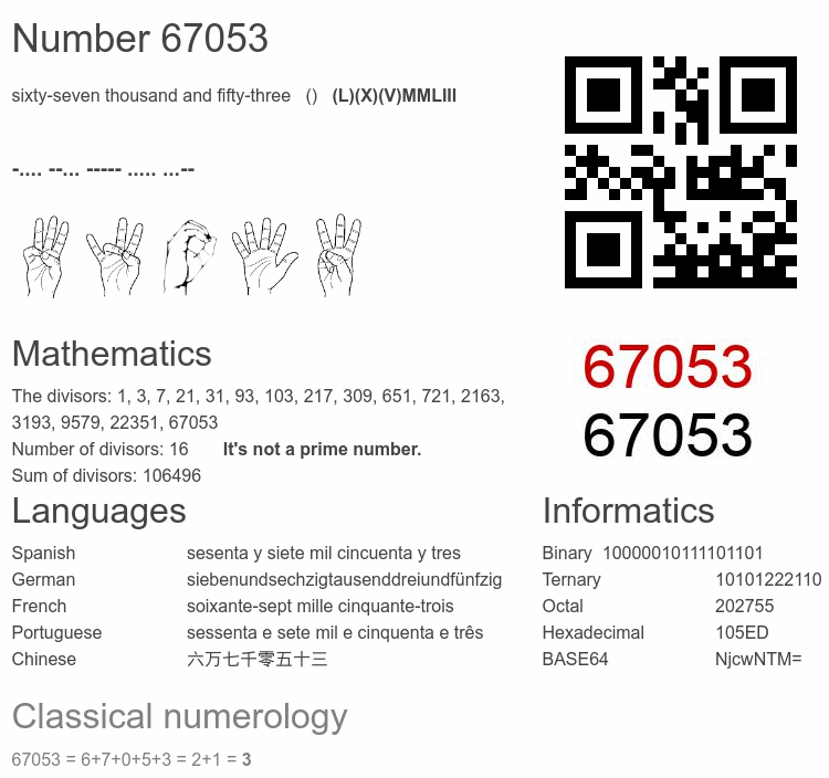 | Spanish: | 🔊 (número 67.053) | sesenta y siete mil cincuenta y tres |