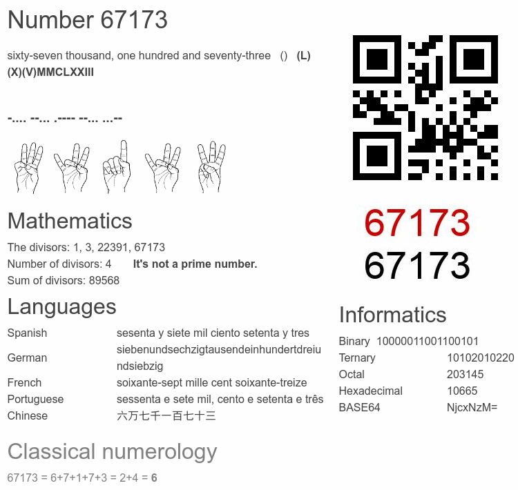 The odd number 67,173 is spelled 🔊, and written in words: sixty-seven thousand, one hundred and seventy-three. The ordinal number 67173rd is said 🔊 and written as: sixty-seven thousand, one hundred and seventy-third. The meaning of the number 67173 in Maths: Is it Prime? Factorization and prime factors tree. The square root and cube root of 67173. What is 67173 in computer science, numerology, codes and images, writing and naming in other languages. Other interesting facts related to 67173.