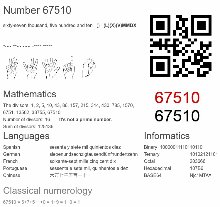 The even number 67,510 is spelled 🔊, and written in words: sixty-seven thousand, five hundred and ten. The ordinal number 67510th is said 🔊 and written as: sixty-seven thousand, five hundred and tenth. The meaning of the number 67510 in Maths: Is it Prime? Factorization and prime factors tree. The square root and cube root of 67510. What is 67510 in computer science, numerology, codes and images, writing and naming in other languages. Other interesting facts related to 67510.