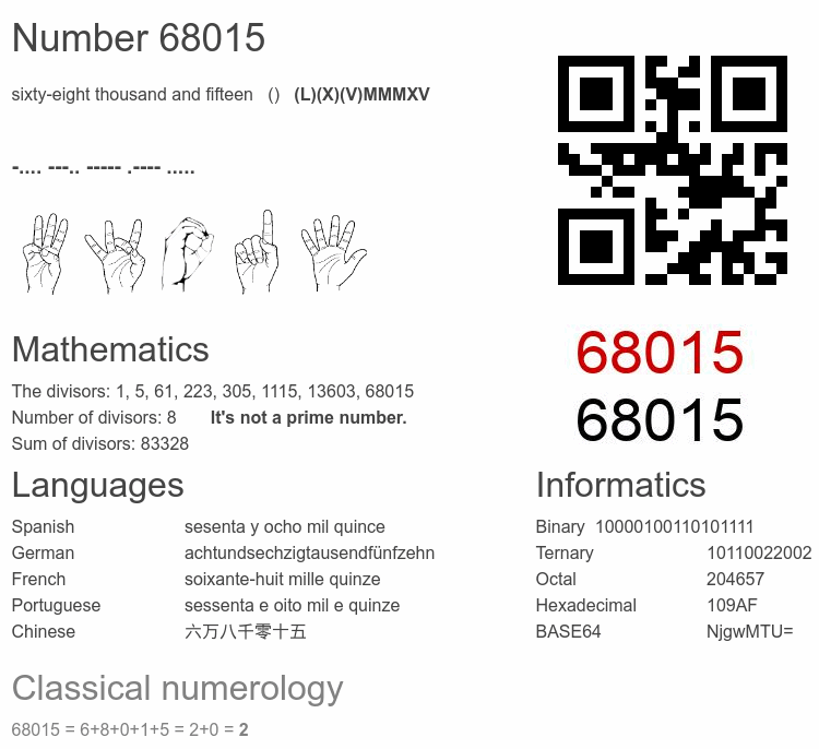 | French: | 🔊 (nombre 68 015) | soixante-huit mille quinze |