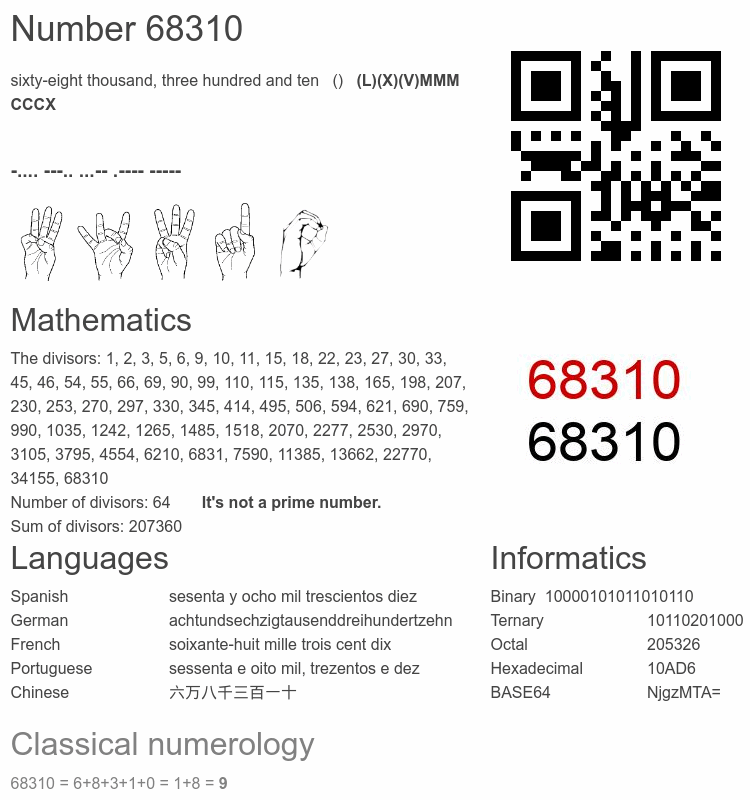 The even number 68,310 is spelled 🔊, and written in words: sixty-eight thousand, three hundred and ten. The ordinal number 68310th is said 🔊 and written as: sixty-eight thousand, three hundred and tenth. The meaning of the number 68310 in Maths: Is it Prime? Factorization and prime factors tree. The square root and cube root of 68310. What is 68310 in computer science, numerology, codes and images, writing and naming in other languages. Other interesting facts related to 68310.