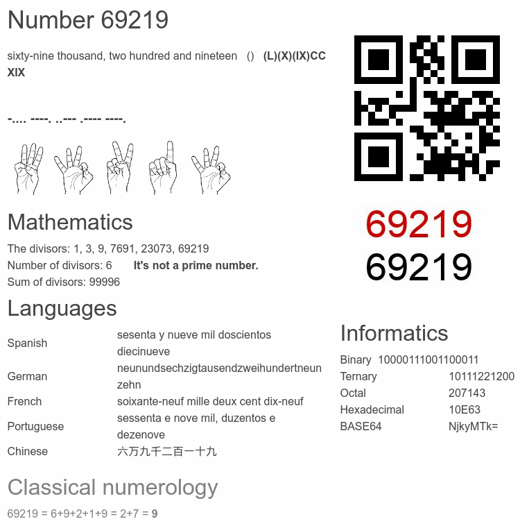The odd number 69,219 is spelled 🔊, and written in words: sixty-nine thousand, two hundred and nineteen. The ordinal number 69219th is said 🔊 and written as: sixty-nine thousand, two hundred and nineteenth. The meaning of the number 69219 in Maths: Is it Prime? Factorization and prime factors tree. The square root and cube root of 69219. What is 69219 in computer science, numerology, codes and images, writing and naming in other languages. Other interesting facts related to 69219.