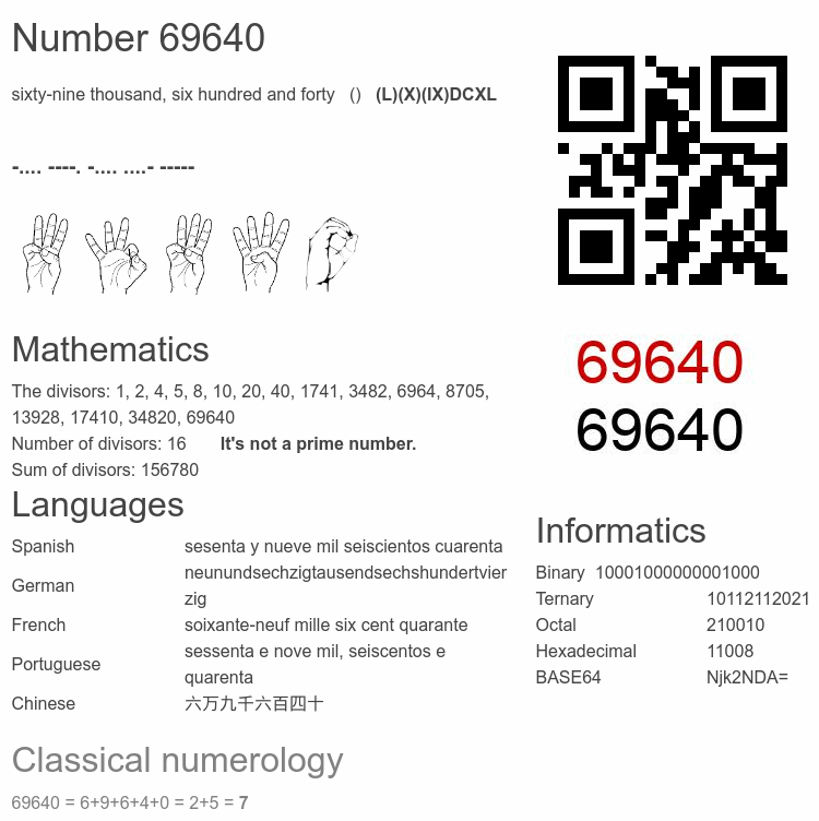 The even number 69,640 is spelled 🔊, and written in words: sixty-nine thousand, six hundred and forty. The ordinal number 69640th is said 🔊 and written as: sixty-nine thousand, six hundred and fortieth. The meaning of the number 69640 in Maths: Is it Prime? Factorization and prime factors tree. The square root and cube root of 69640. What is 69640 in computer science, numerology, codes and images, writing and naming in other languages. Other interesting facts related to 69640.