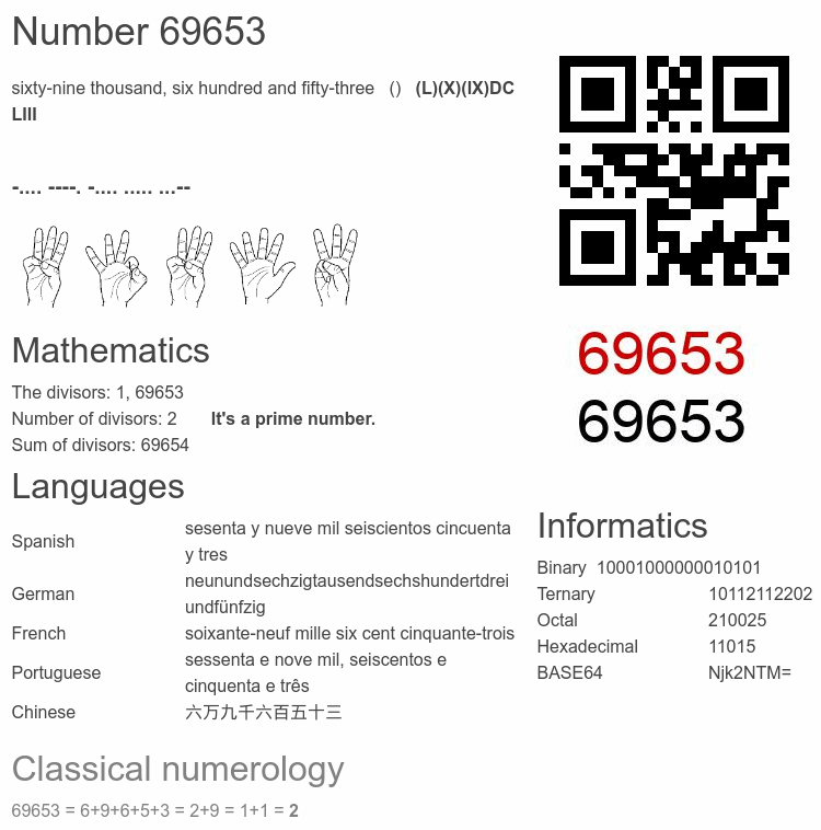 | Spanish: | 🔊 (número 69.653) | sesenta y nueve mil seiscientos cincuenta y tres |