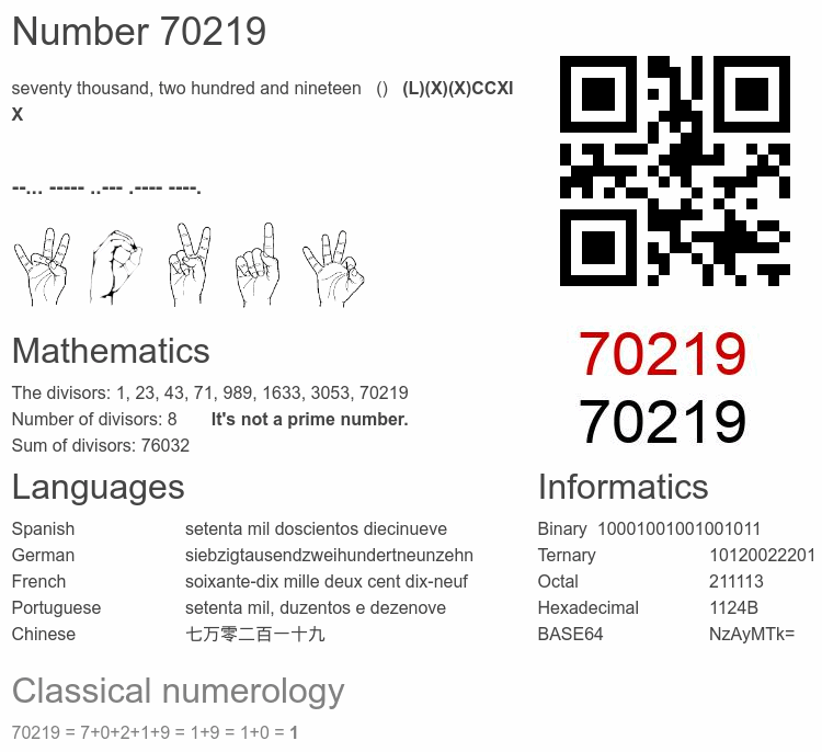 | Portuguese: | 🔊 (número 70 219) | setenta mil, duzentos e dezenove |