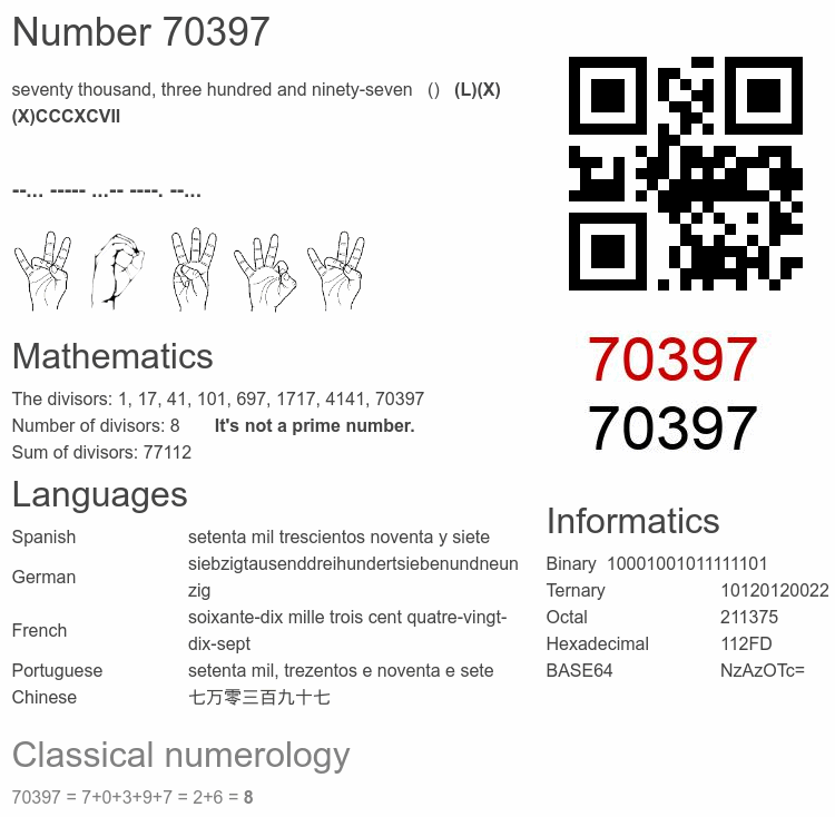 The odd number 70,397 is spelled 🔊, and written in words: seventy thousand, three hundred and ninety-seven. The ordinal number 70397th is said 🔊 and written as: seventy thousand, three hundred and ninety-seventh. The meaning of the number 70397 in Maths: Is it Prime? Factorization and prime factors tree. The square root and cube root of 70397. What is 70397 in computer science, numerology, codes and images, writing and naming in other languages. Other interesting facts related to 70397.