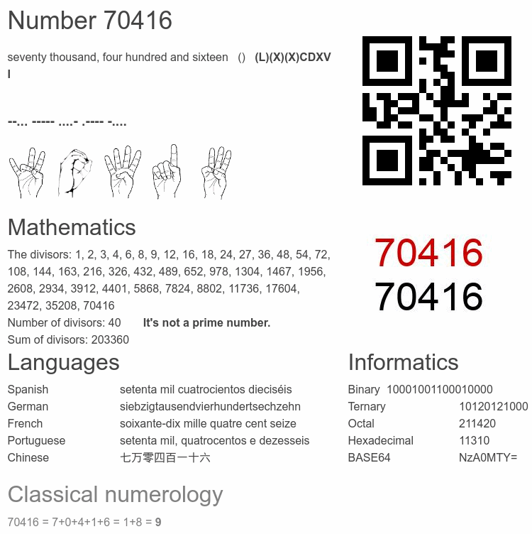 | Portuguese: | 🔊 (número 70 416) | setenta mil, quatrocentos e dezesseis |