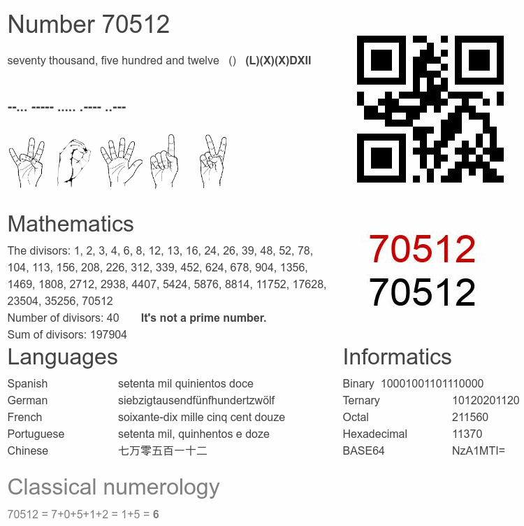 | French: | 🔊 (nombre 70 512) | soixante-dix mille cinq cent douze |