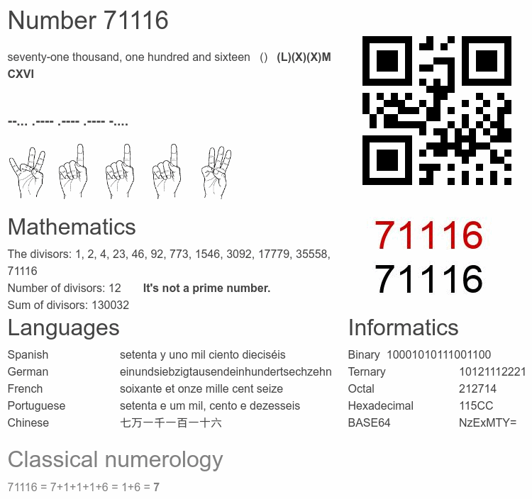 | French: | 🔊 (nombre 71 116) | soixante et onze mille cent seize |