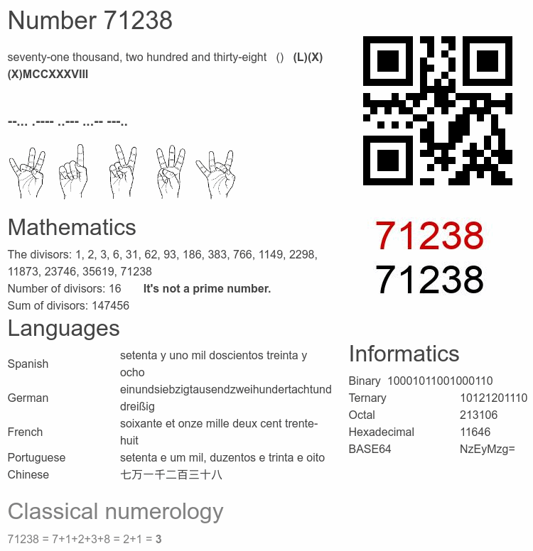 If you know something interesting about the number 71238 or any natural number (positive integer), please write to us.What is 71,238 in other units