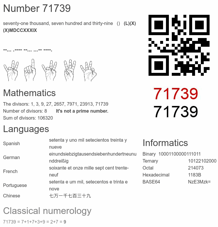 The odd number 71,739 is spelled 🔊, and written in words: seventy-one thousand, seven hundred and thirty-nine. The ordinal number 71739th is said 🔊 and written as: seventy-one thousand, seven hundred and thirty-ninth. The meaning of the number 71739 in Maths: Is it Prime? Factorization and prime factors tree. The square root and cube root of 71739. What is 71739 in computer science, numerology, codes and images, writing and naming in other languages. Other interesting facts related to 71739.
