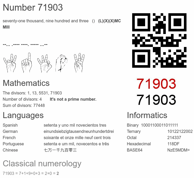 | Chinese: | 🔊 (数 71 903) | 七万一千九百零三 |