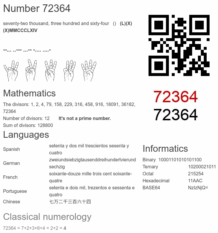 | Portuguese: | 🔊 (número 72 364) | setenta e dois mil, trezentos e sessenta e quatro |