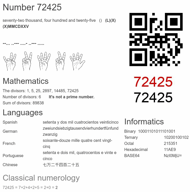 | Arabian: | 🔊 (عدد 72,425) | اثنان و سبعون ألفاً و أربعمائة و خمسة و عشرون |