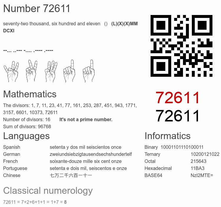 | Spanish: | 🔊 (número 72.611) | setenta y dos mil seiscientos once |