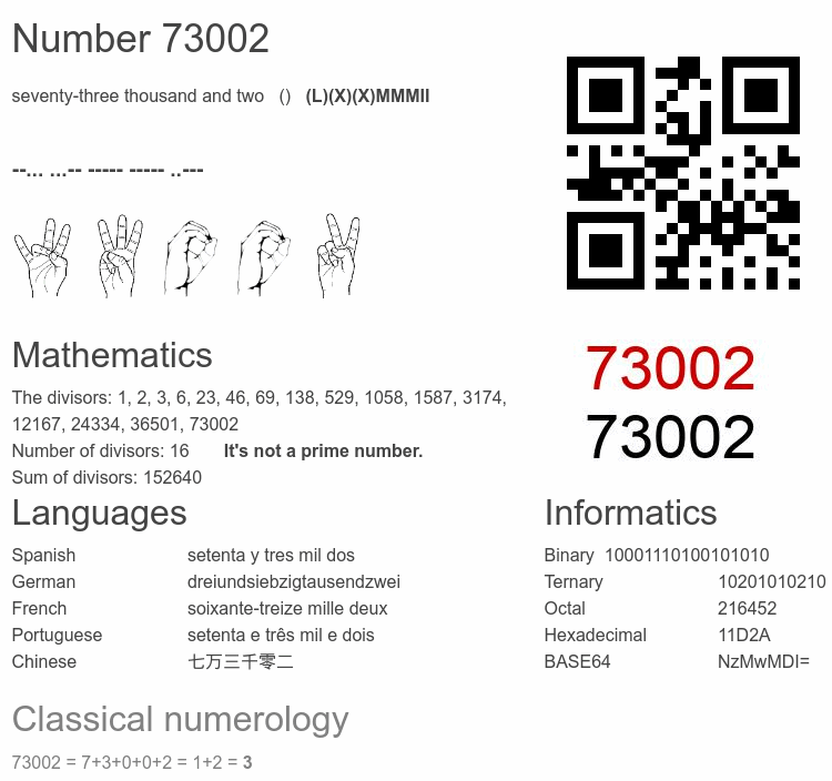 | Arabian: | 🔊 (عدد 73,002) | ثلاثة و سبعون ألفاً و اثنان |