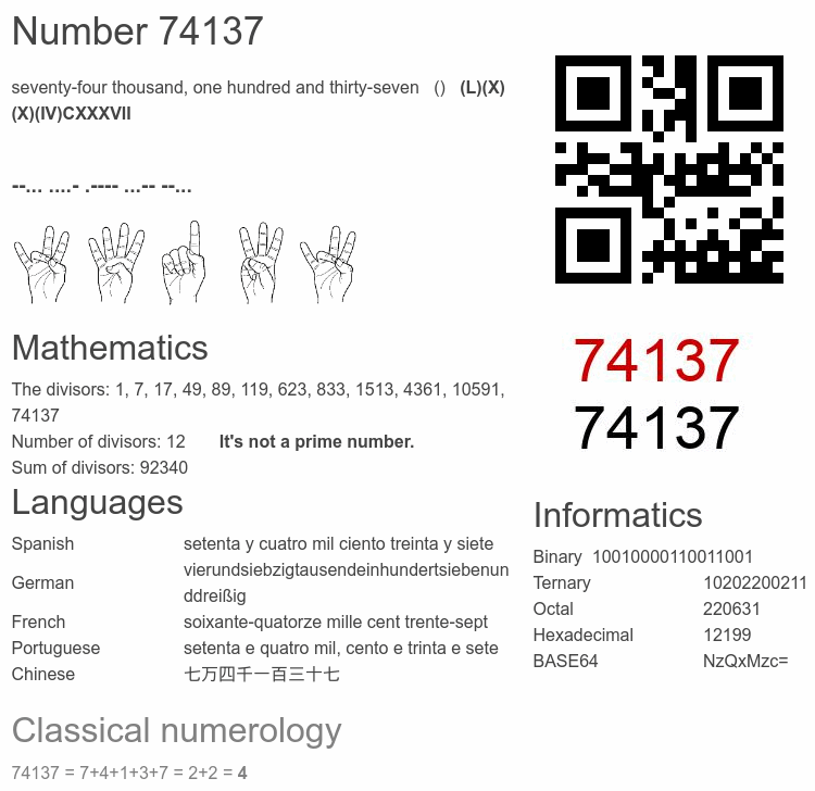 The odd number 74,137 is spelled 🔊, and written in words: seventy-four thousand, one hundred and thirty-seven. The ordinal number 74137th is said 🔊 and written as: seventy-four thousand, one hundred and thirty-seventh. The meaning of the number 74137 in Maths: Is it Prime? Factorization and prime factors tree. The square root and cube root of 74137. What is 74137 in computer science, numerology, codes and images, writing and naming in other languages. Other interesting facts related to 74137.