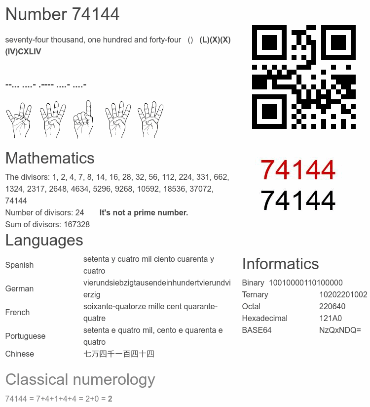 | Chinese: | 🔊 (数 74 144) | 七万四千一百四十四 |