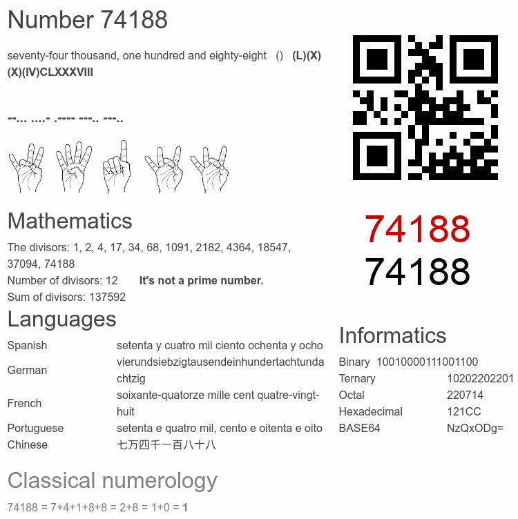 | Portuguese: | 🔊 (número 74 188) | setenta e quatro mil, cento e oitenta e oito |