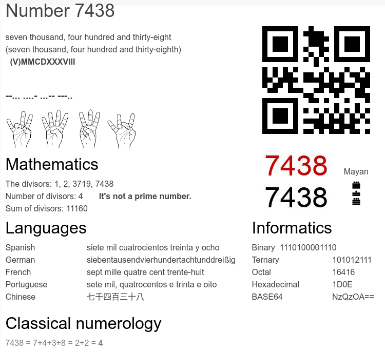 | Chinese: | 🔊 (数 7 438) | 七千四百三十八 |