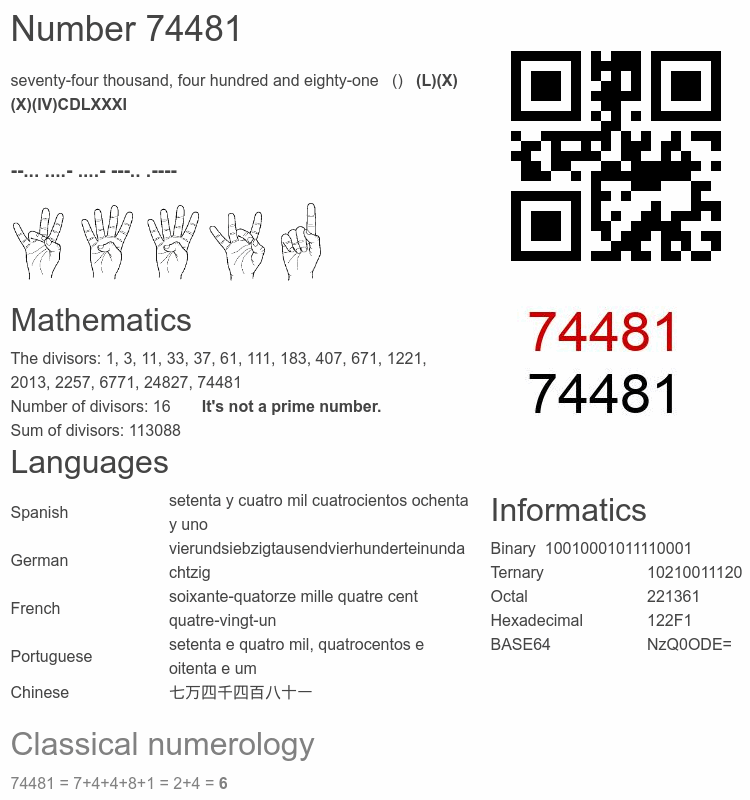 | Spanish: | 🔊 (número 74.481) | setenta y cuatro mil cuatrocientos ochenta y uno |