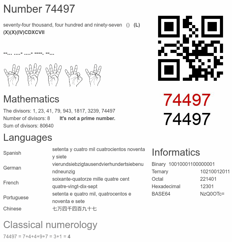 | Portuguese: | 🔊 (número 74 497) | setenta e quatro mil, quatrocentos e noventa e sete |