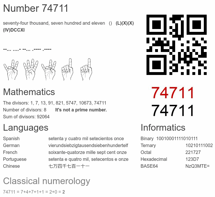 | Spanish: | 🔊 (número 74.711) | setenta y cuatro mil setecientos once |