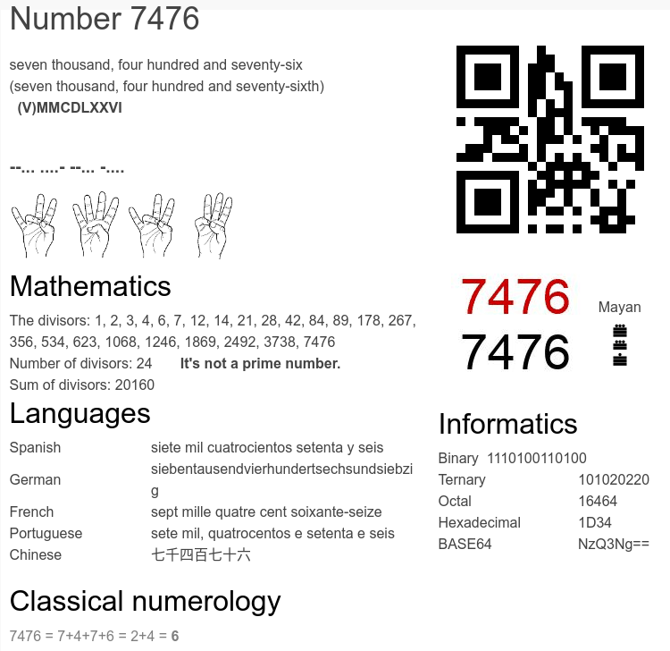 If you know something interesting about the number 7476 or any natural number (positive integer), please write to us.What is 7,476 in other units
