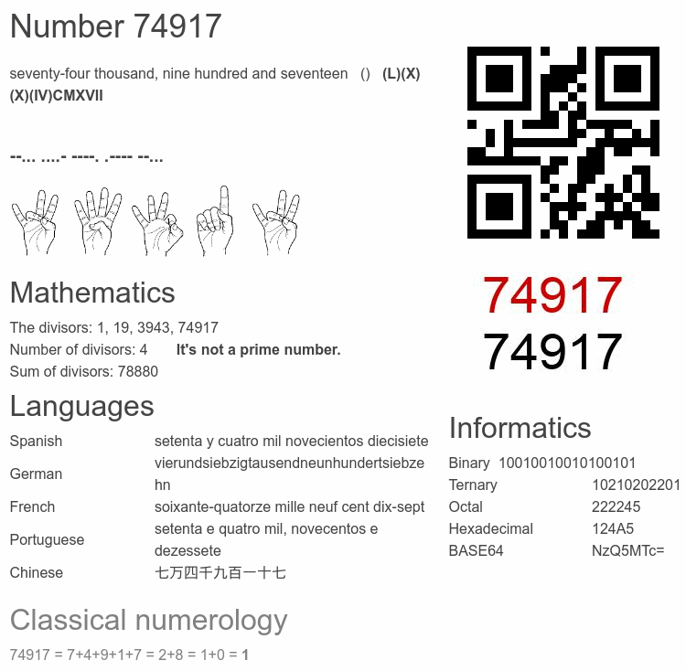 | Portuguese: | 🔊 (número 74 917) | setenta e quatro mil, novecentos e dezessete |