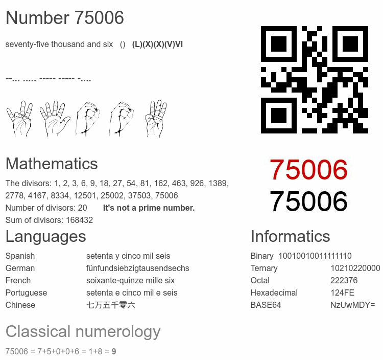 The even number 75,006 is spelled 🔊, and written in words: seventy-five thousand and six. The ordinal number 75006th is said 🔊 and written as: seventy-five thousand and sixth. The meaning of the number 75006 in Maths: Is it Prime? Factorization and prime factors tree. The square root and cube root of 75006. What is 75006 in computer science, numerology, codes and images, writing and naming in other languages. Other interesting facts related to 75006.