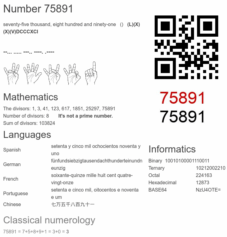 The odd number 75,891 is spelled 🔊, and written in words: seventy-five thousand, eight hundred and ninety-one. The ordinal number 75891st is said 🔊 and written as: seventy-five thousand, eight hundred and ninety-first. The meaning of the number 75891 in Maths: Is it Prime? Factorization and prime factors tree. The square root and cube root of 75891. What is 75891 in computer science, numerology, codes and images, writing and naming in other languages. Other interesting facts related to 75891.