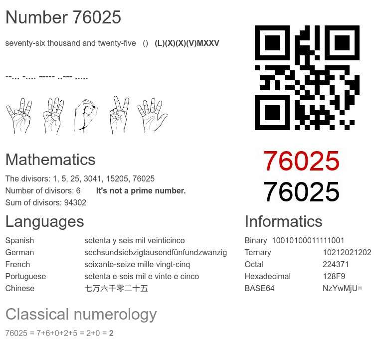 The odd number 76,025 is spelled 🔊, and written in words: seventy-six thousand and twenty-five. The ordinal number 76025th is said 🔊 and written as: seventy-six thousand and twenty-fifth. The meaning of the number 76025 in Maths: Is it Prime? Factorization and prime factors tree. The square root and cube root of 76025. What is 76025 in computer science, numerology, codes and images, writing and naming in other languages. Other interesting facts related to 76025.