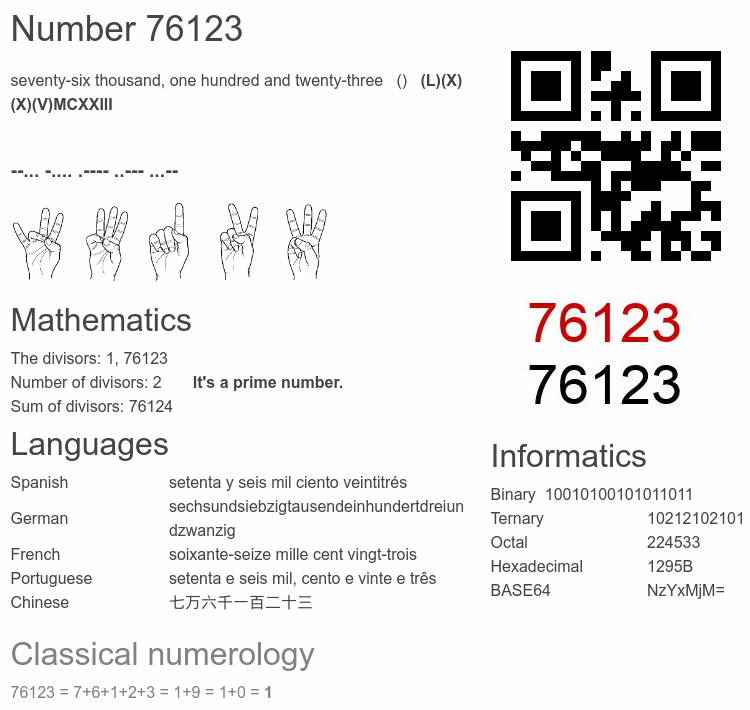 The odd number 76,123 is spelled 🔊, and written in words: seventy-six thousand, one hundred and twenty-three. The ordinal number 76123rd is said 🔊 and written as: seventy-six thousand, one hundred and twenty-third. The meaning of the number 76123 in Maths: Is it Prime? Factorization and prime factors tree. The square root and cube root of 76123. What is 76123 in computer science, numerology, codes and images, writing and naming in other languages. Other interesting facts related to 76123.